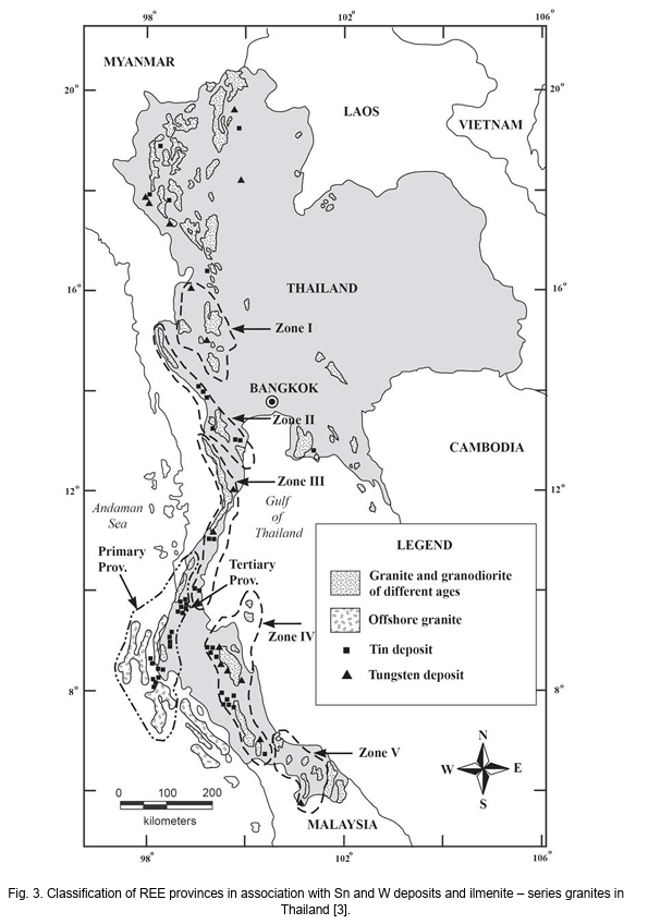 - สายแร่ที่เกี่ยวข้องกับดีบุกและทังสเตน โดยเฉพาะในภาคใต้ ซึ่งการสะสมของแร่ในตะกอนลำน้ำและชายฝั่งทำให้เกิดแหล่งแร่แรร์เอิร์ธที่มีค่าทางเศรษฐกิจ