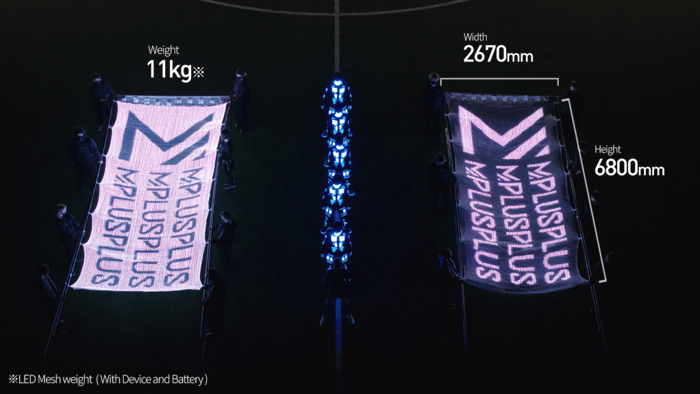 MPLUSPLUS พัฒนา “LED MEGA MESH” ซึ่งเป็นจอแสดงผล LED แบบผ้าที่มีน้ำหนักเบาเพียง 11 กิโลกรัม รวมแบตเตอรี่และอุปกรณ์ควบคุม สามารถพับเก็บและพกพาได้สะดวก LED MEGA MESH มาพร้อมกับ LED กว่า 17,280 ดวง และสามารถนำไปใช้ได้ในหลายรูปแบบ เช่น งานกีฬา เทศกาล คอนเสิร์ต และป้ายโฆษณาดิจิทัล เทคโนโลยีของ MPLUSPLUS เปิดโอกาสให้แฟชั่นก้าวข้ามขีดจำกัดของสิ่งทอแบบเดิม ๆ ไปสู่มิติใหม่ของการแสดงออกผ่านแสงและภาพเคลื่อนไหว